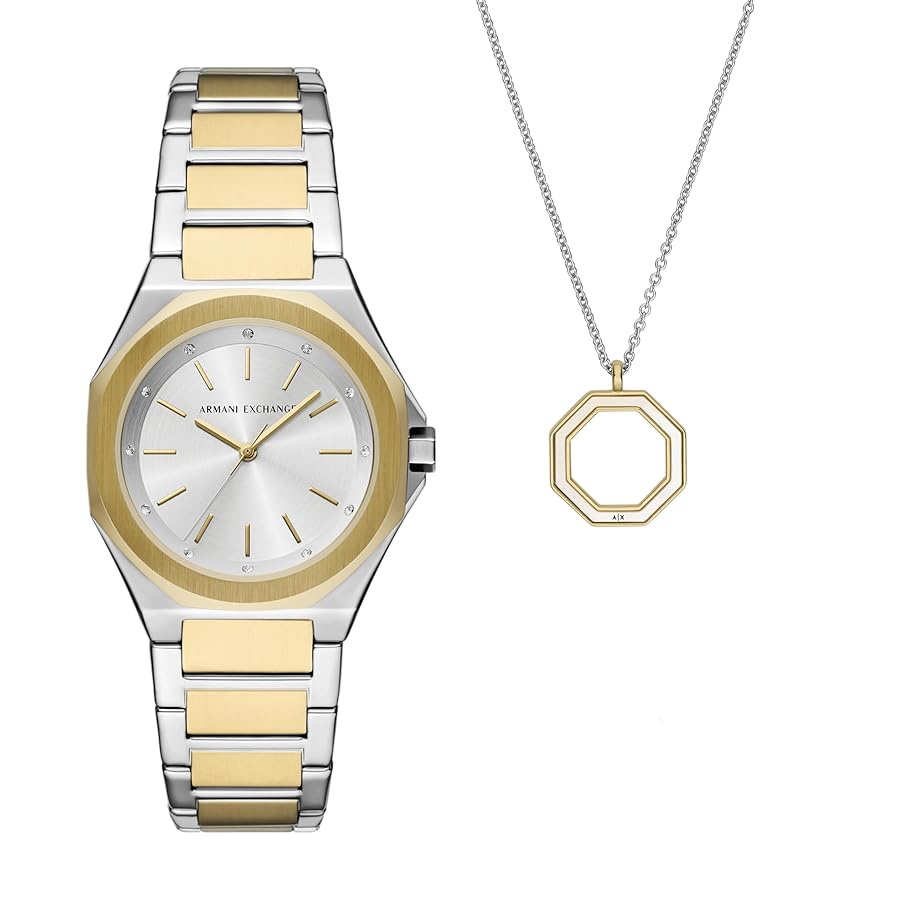 Das Besondere am AX7161SET ist die Zwei-Ton-Edelstahloptik, die Kombination aus Uhr & Halskette sowie die Zirkonia-Verzierung im Gesichtsteil. Viele Sets bieten entweder Uhr allein oder silberfarbenes Finish ohne Steinakzente.