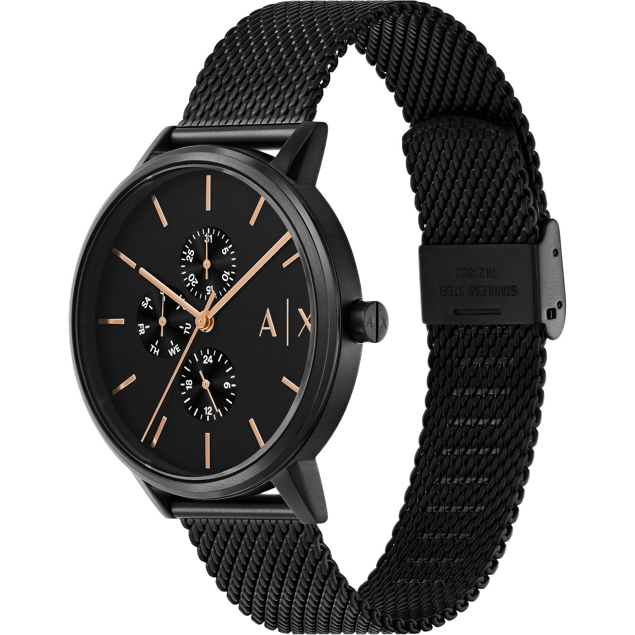 AX7162SET ist ein Geschenkset mit Uhr & Kette, komplett in Schwarz und mit Milanaise-Band. Viele Modelle verzichten auf die Kette oder haben andere Finishs wie Silber- oder Goldtöne.