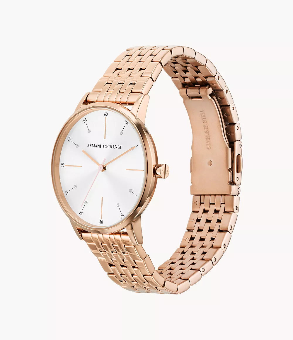 Die Materialien sind hochwertiger Edelstahl in Roségoldoptik und ein mineralisches Glas. Die Verarbeitung bei Armani Exchange steht für gute Haltbarkeit und elegante Oberfläche – ideale Kombi aus Mode und Alltagstauglichkeit.