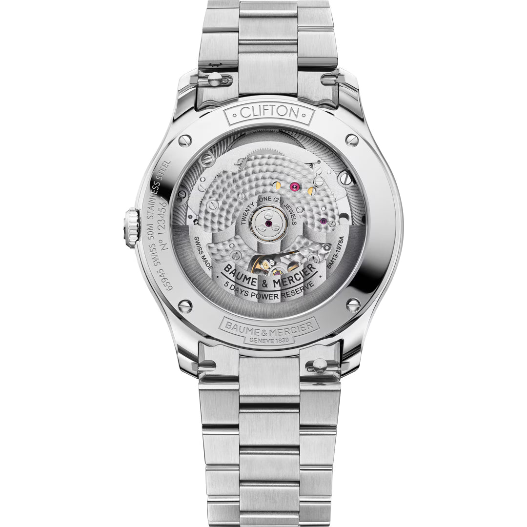 Gegenüber früheren Clifton-Varianten fällt die MOA10793 durch das neue 39-mm-Gehäuse mit integrierter Metallgliederband, das gekörnte Off-White Zifferblatt, die Gold-Akzente und den schwarzen Crosshair hervor. Zudem bietet sie mit 5 Tagen Gangreserve und dem überarbeiteten Baumatic Werk technische Vorteile gegenüber einfacheren Clifton-Modellen.
