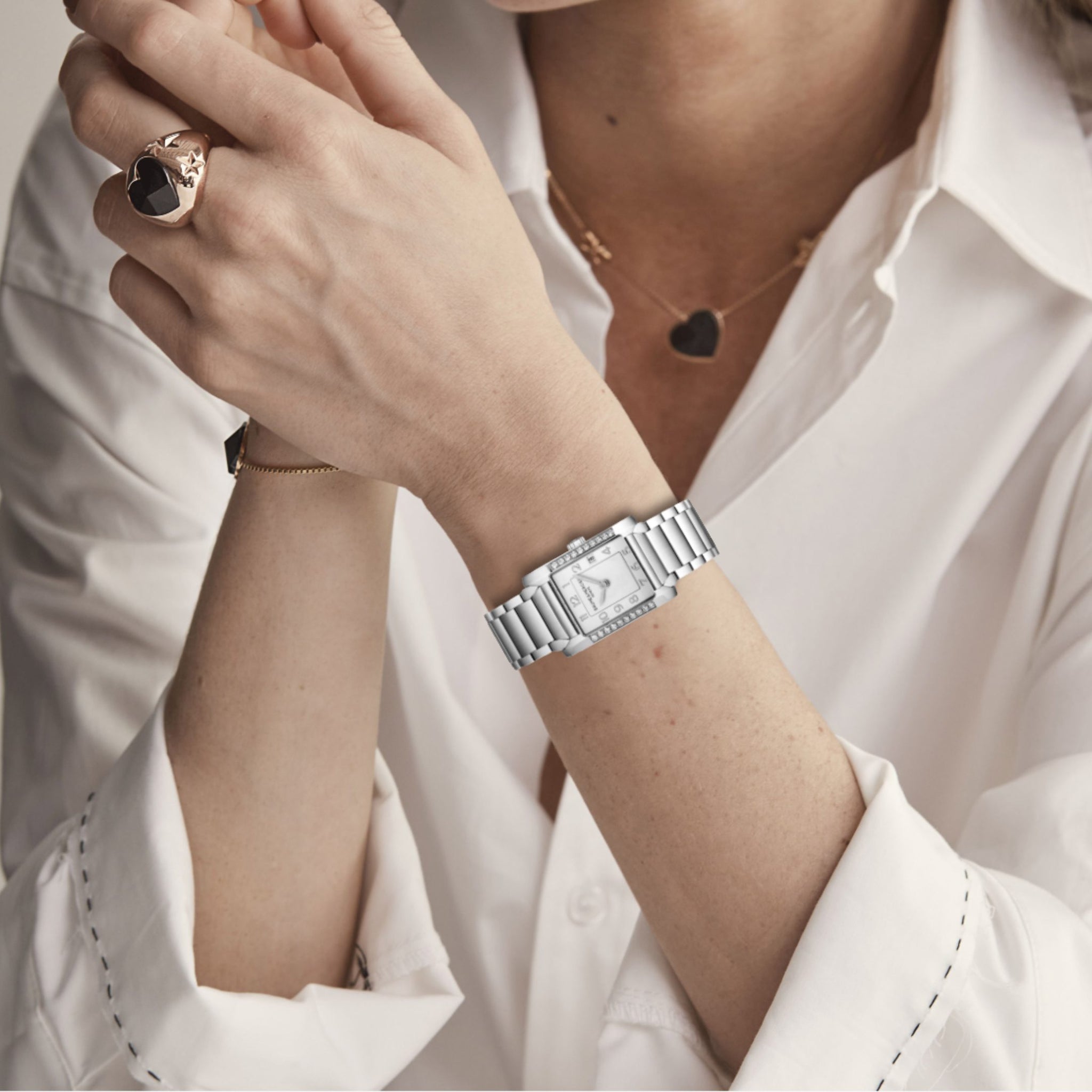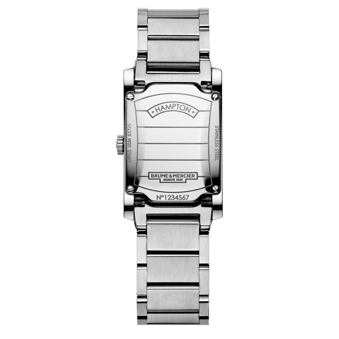 Die MOA10051 zeichnet sich durch Diamantbesatz, Perlmutt-Zifferblatt und rechteckige Form aus. Andere Hampton-Modelle können ohne Steine, mit anderen Zifferblattfarben oder Materialien—wie Lederarmband—erhältlich sein.