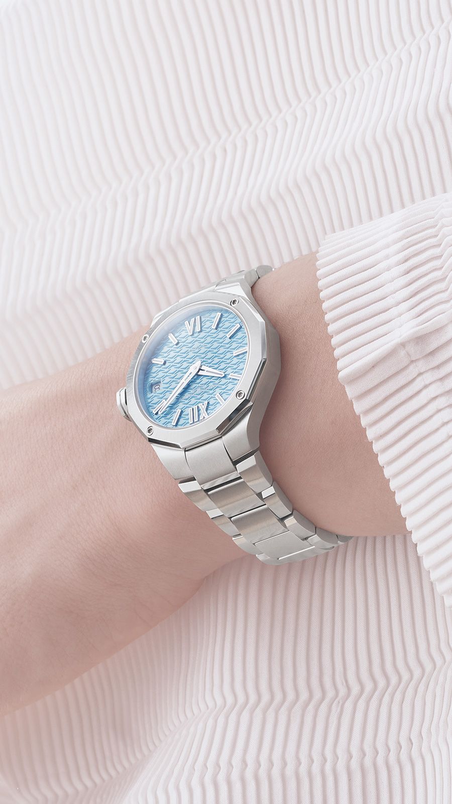 Ob im Business-Alltag, bei entspannten Wochenendplänen oder beim feinen Abendessen – die Riviera ist wandlungsfähig. Das elegante Edelstahlgehäuse harmoniert mit einem kalt-blauen Zifferblatt und der Wechselarmband-Mechanik erlaubt, unkompliziert zwischen sportlich und chic zu wechseln.