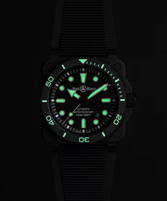 - Leuchtendes Design: Zeiger und Indexe sind nur als Konturen ausgeführt – dank Super-LumiNova® X2 entstehen neonartige Umrisse bei Dunkelheit. ([osterjewelers.com](https://www.osterjewelers.com/products/bell-ross-br-03-diver-lum-outline?utm_source=openai))