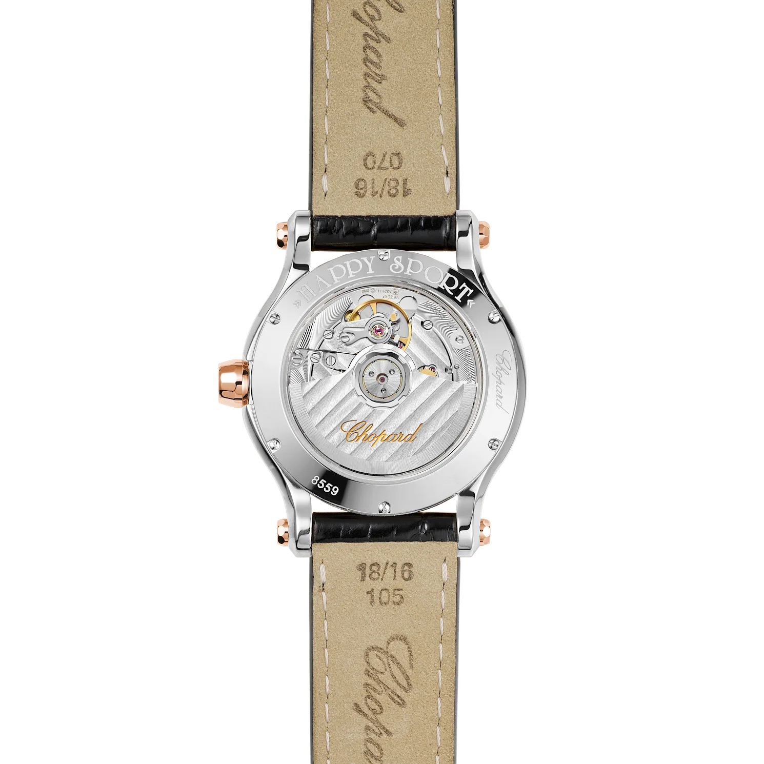 Wichtiges Unterscheidungsmerkmal sind hier das Material (Roségold + Lucent Steel™), die Anzahl der "tanzenden" Diamanten (sieben), das Guilloché-Zifferblatt und das Automatikwerk mit ca. 62 Stunden Gangreserve – nicht alle Happy Sport Modelle bieten diese Ausstattung.