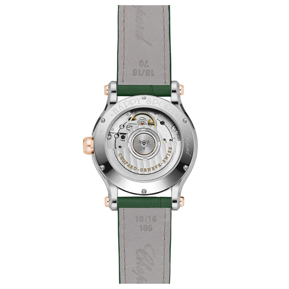 Stilvolle Ausdruckskraft, feminine Eleganz und handwerkliche Perfektion – die Chopard Happy Sport Automatic Diamonds 278578-6002 ist mehr als eine Uhr: Sie ist ein Statement für Ihre Persönlichkeit. Die Kombination aus Edelstahl und 18K Roségold, das grüne Perlmutt-Zifferblatt mit tanzenden Diamanten und das elegante Alligatorleder-Band schaffen Flair und Ausdruck.