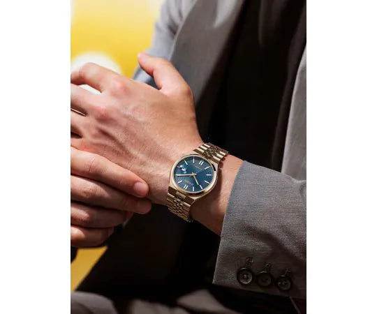 Der Roségold-Ton passt ideal zu warmen Hauttönen und Erdfarben wie Beige, Braun, Oliv. Blaues Zifferblatt und goldenes Gehäuse harmonieren mit Navy, Grau und Schwarz und bringen elegante Kontraste.