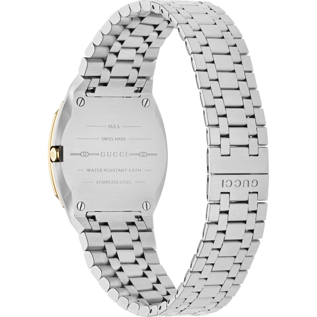 Während die G-Timeless meist klassisch-rund und flacher gestaltet ist, hebt sich die 25H durch ihr mehrlagiges, architektonisch inspiriertes Gehäuse sowie auffällige Details wie das Interlocking-G und die Gelbgold-Akzente ab. Beide Modelle sind Swiss Made, doch die 25H richtet sich an Liebhaber von Design mit Statement.