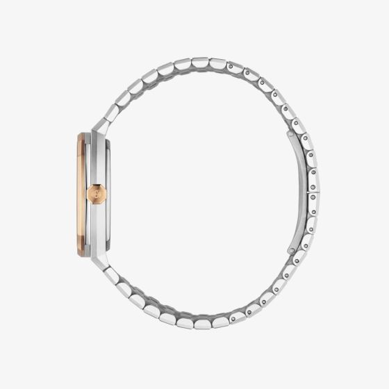 Gehäuse und Armband bestehen aus Edelstahl, die Lünette ist rosé-goldfarben plattiert. Für das Zifferblatt wurde Silber-Finish mit dem ikonischen Interlocking-G gewählt.