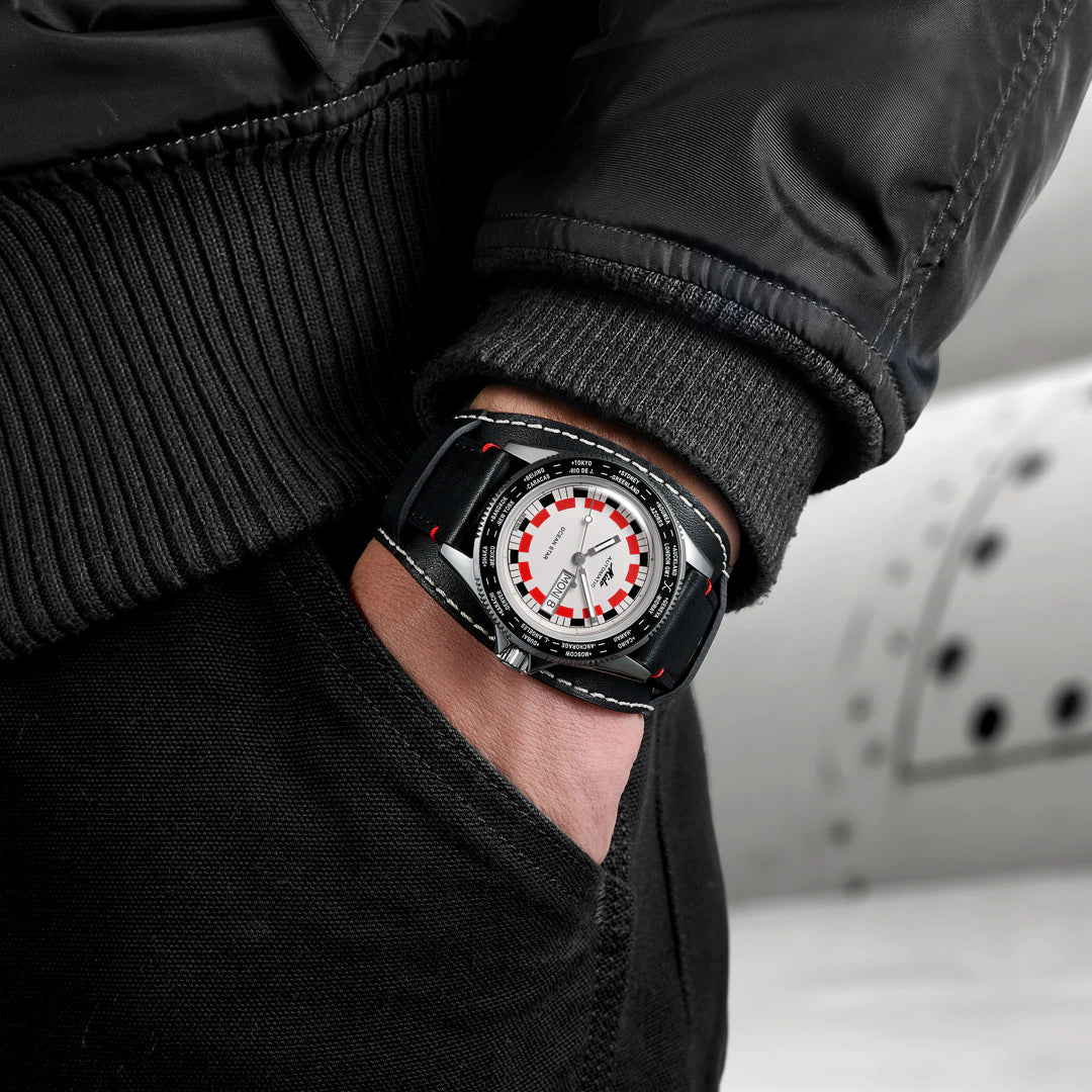 Egal ob im Büro, auf Reisen oder beim entspannten Wochenende – diese Uhr überzeugt. Ihre Weltzeit-Lünette gibt Ihnen schnell Überblick über verschiedene Zeitzonen, das Lederarmband mit Bund-Style sorgt für Komfort und ein markantes Erscheinungsbild, und die 200 Meter Wasserdichtigkeit machen sie fit auch für intensive Tage am Wasser.