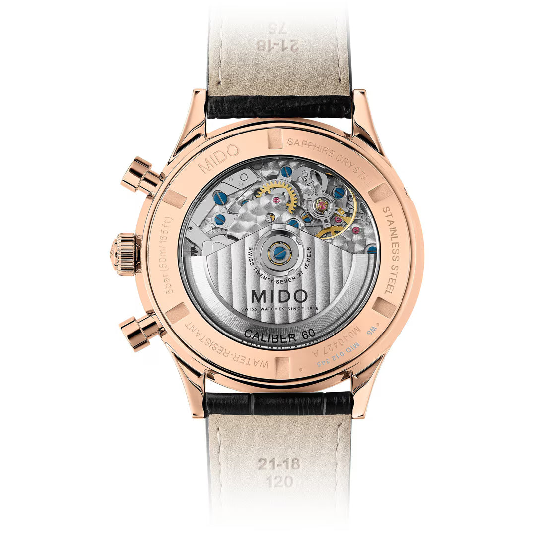 - Reiches historisches Erbe Entwurf inspiriert von MIDO’s Multichrono von 1937, inklusive Vintage-Mido-Logo und Tachymeter-Skala.