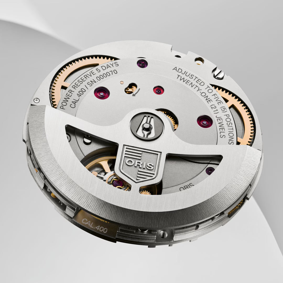 | Bewegung | Oris Kaliber 400 Automatik, 4 Hz, 120 h Gangreserve |
