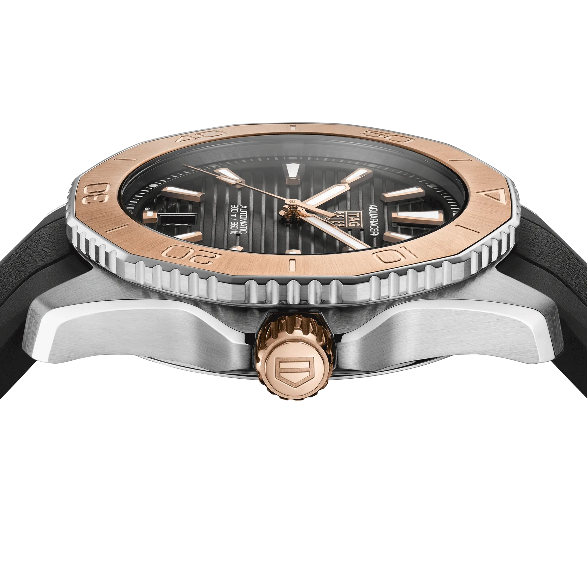 Diese Variante kombiniert Stahl und 18K Rosé-Gold sowie ein "Smokey" Zifferblatt. Andere Aquaracer-Modelle etwa verzichten auf Gold oder verwenden andere Farben und Bänder – so wird dieses Modell besonders edel und unverwechselbar.