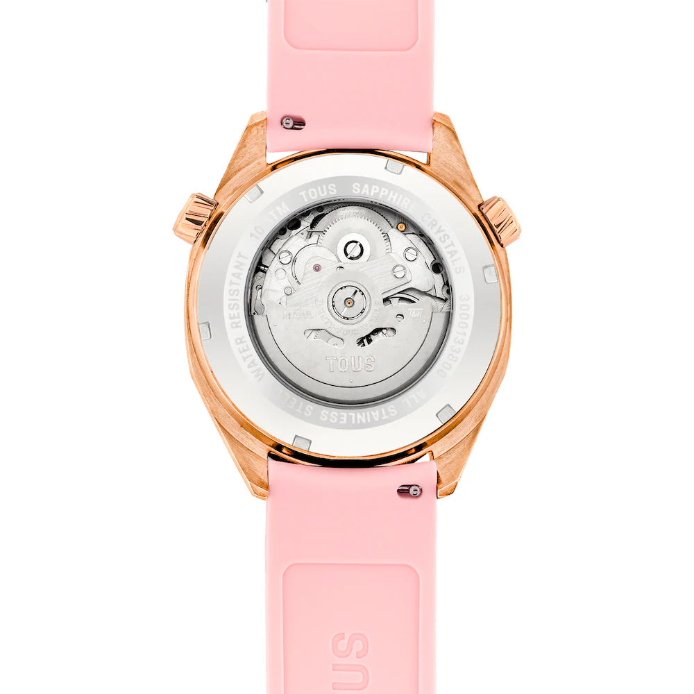 Das Gehäuse aus IP-rosé-beschichtetem Edelstahl bietet langlebige Oberfläche; das automatische Werk sorgt für kontinuierliche Bewegung und Prestige. TOUS verwendet Materialien nach höchsten Standards.