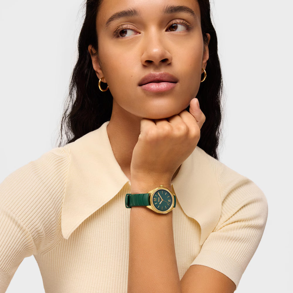 Im Vergleich zu Varianten mit Stahlarmband oder Schmuckelementen ist dieses Modell grüner und sportlicher. Ohne Edelsteinbesatz und mit Silikonband liegt der Fokus auf Alltagstauglichkeit und Farbexplosion.