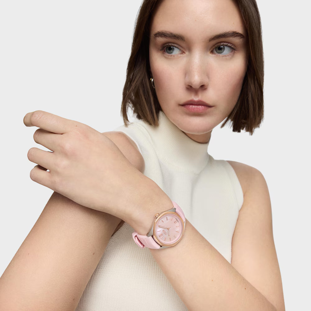 Im Vergleich zu den klassischeren Modelle mit Metallarmband und Silber- oder Bicolor-Tönen vereint dieses Modell farbliche Auffälligkeit und sportliche Eleganz. Das pinke Band und der Perlmuttglanz machen es markanter als viele schlichtere Varianten.