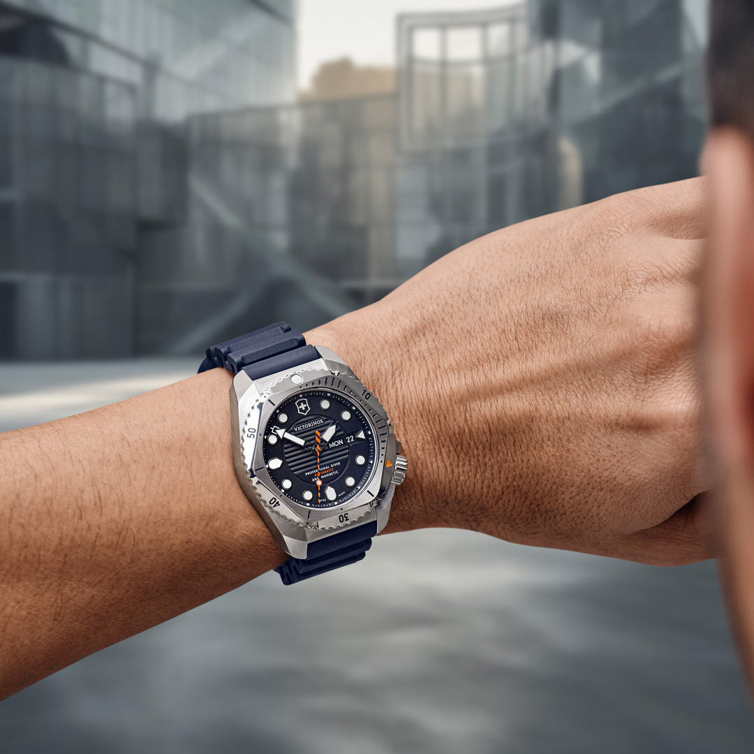 Ein Zeitmesser, der verfügbare Grenzen überschreitet Die Victorinox V241995 Dive Pro Automatic verbindet robustes Design mit sportlicher Eleganz und Schweizer Präzision. Ein Statement für Anspruch, Qualität und stilvolle Vielseitigkeit – geschaffen für alle, die sich nicht mit Mittelmass zufriedengeben.
