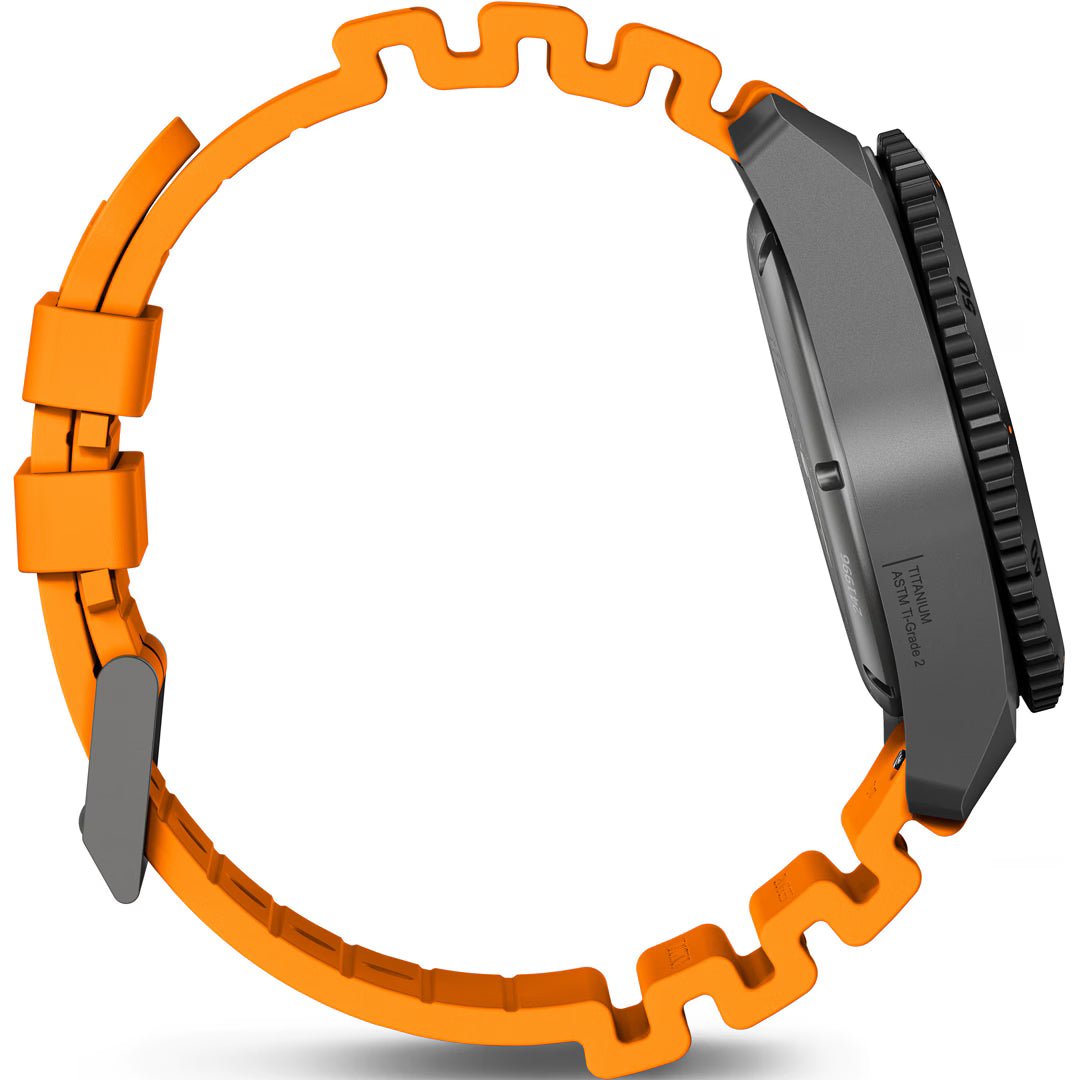 Diese Uhr leistet nicht nur unter Wasser Höchstes Mit ihrer Wasserdichtigkeit bis 300 m, ISO-6425-Zertifizierung und antimagnetischen wie stossresistenten Eigenschaften begleitet sie dich überallhin. Das leichte Titan-Gehäuse sorgt für Tragekomfort, während das orange Gummiarmband und die schwarze, matte Zifferblattgestaltung mit markanten Details einen sportlichen Akzent setzen.
